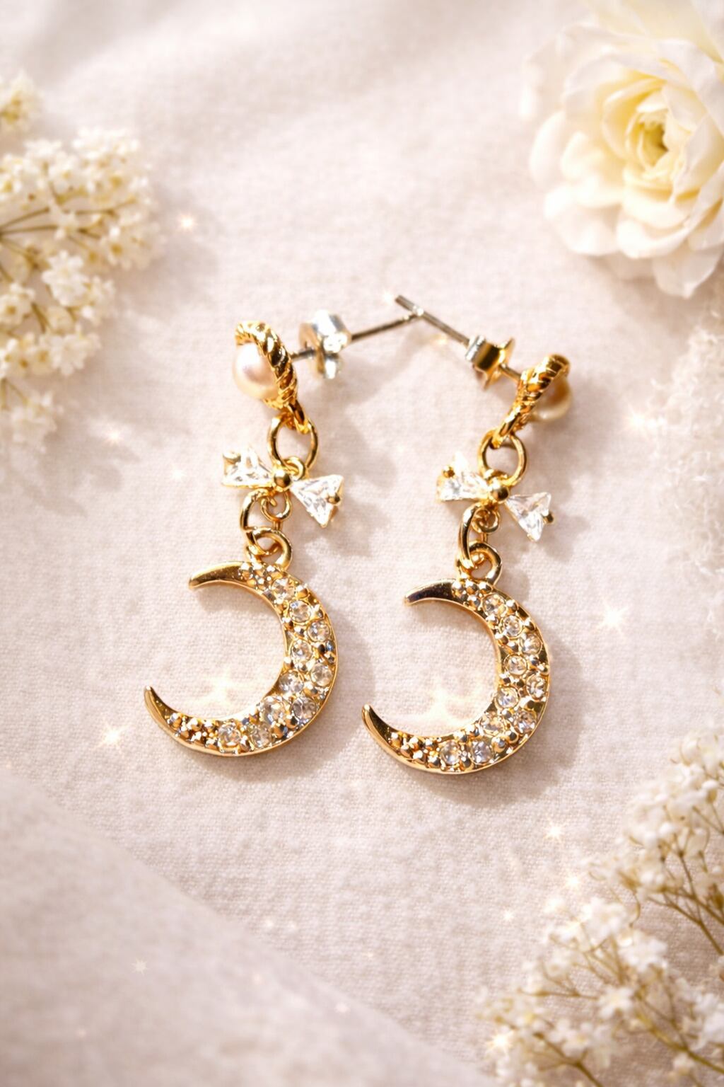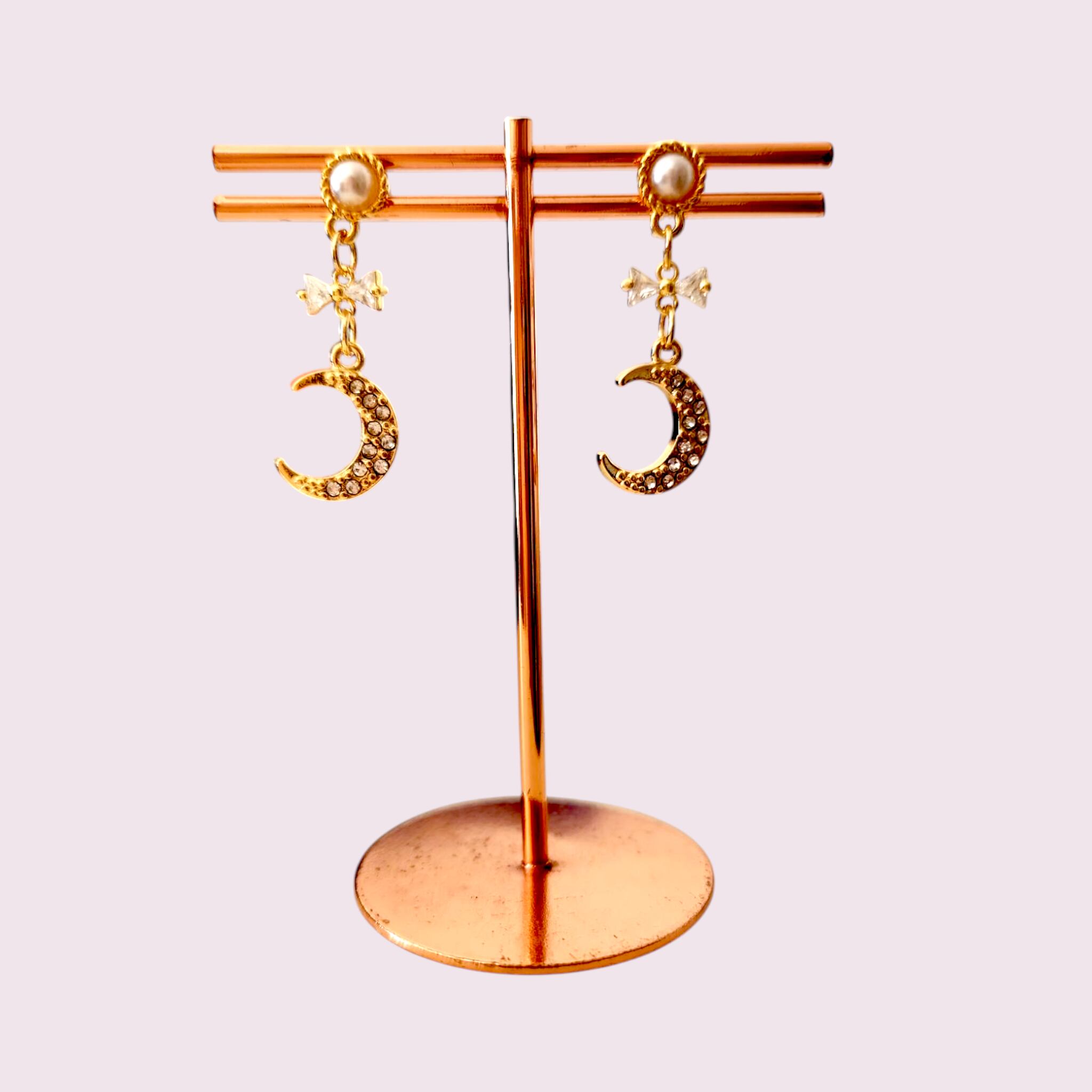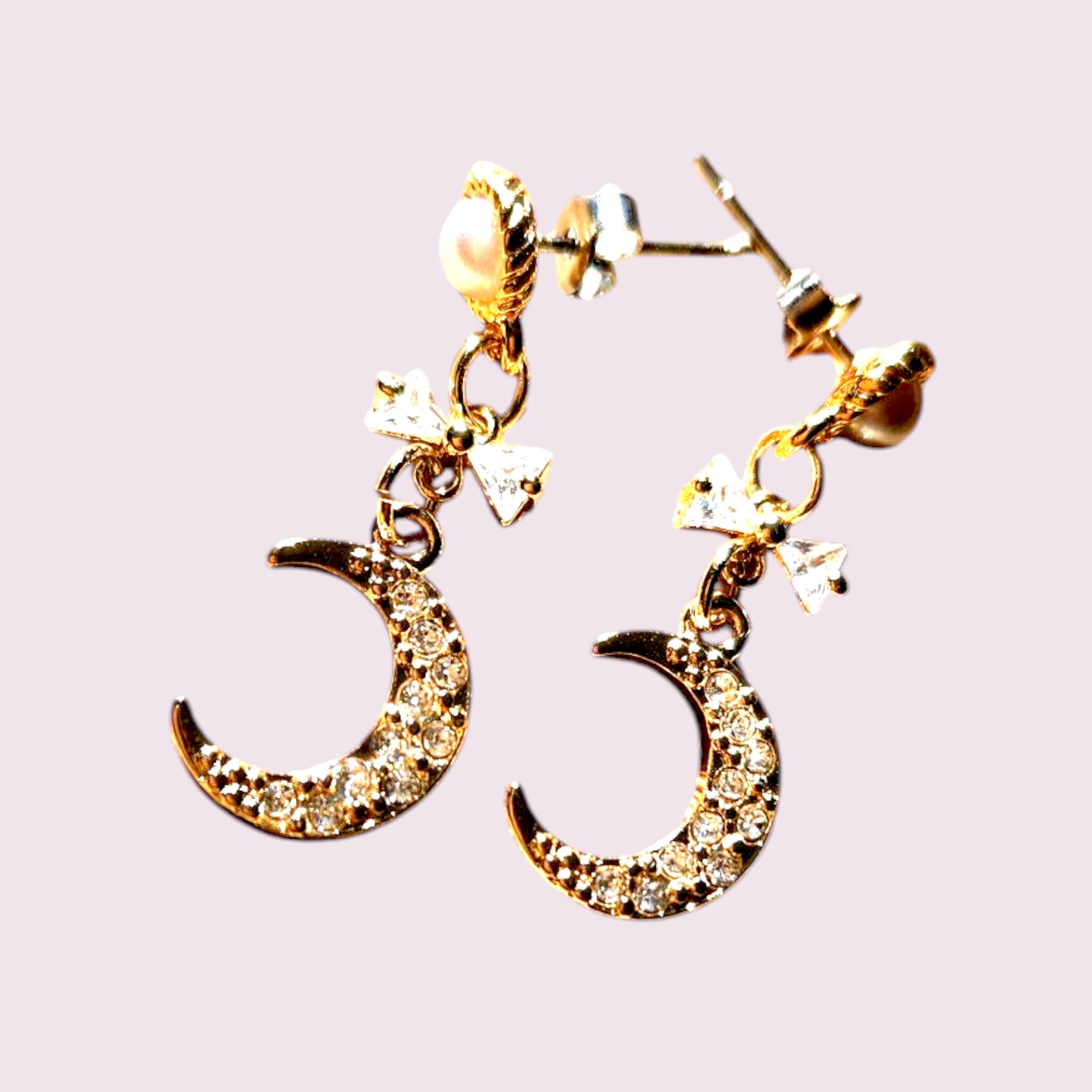 ムーンチャームが耳元を優美に飾り、透明感溢れるクリスタルがきらめくピアスです。シンプルながらも存在感があり、様々なスタイルにマッチする素敵なアクセサリーです。