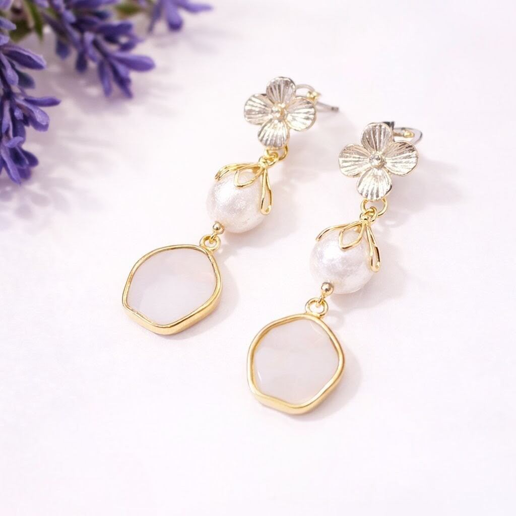 フラワー×コットンパールとシェルチャームの揺れるピアス|大人可愛い 上品アクセサリー