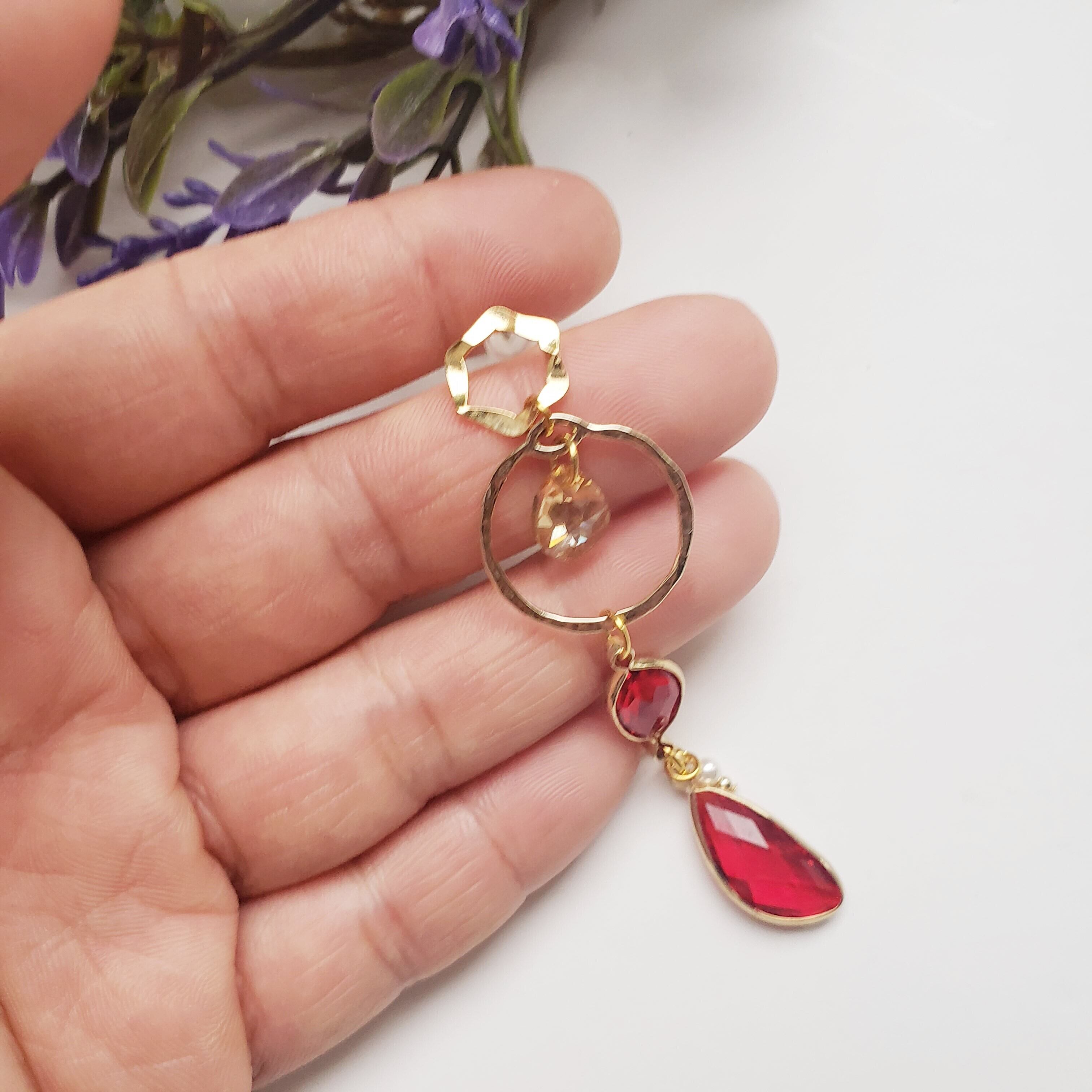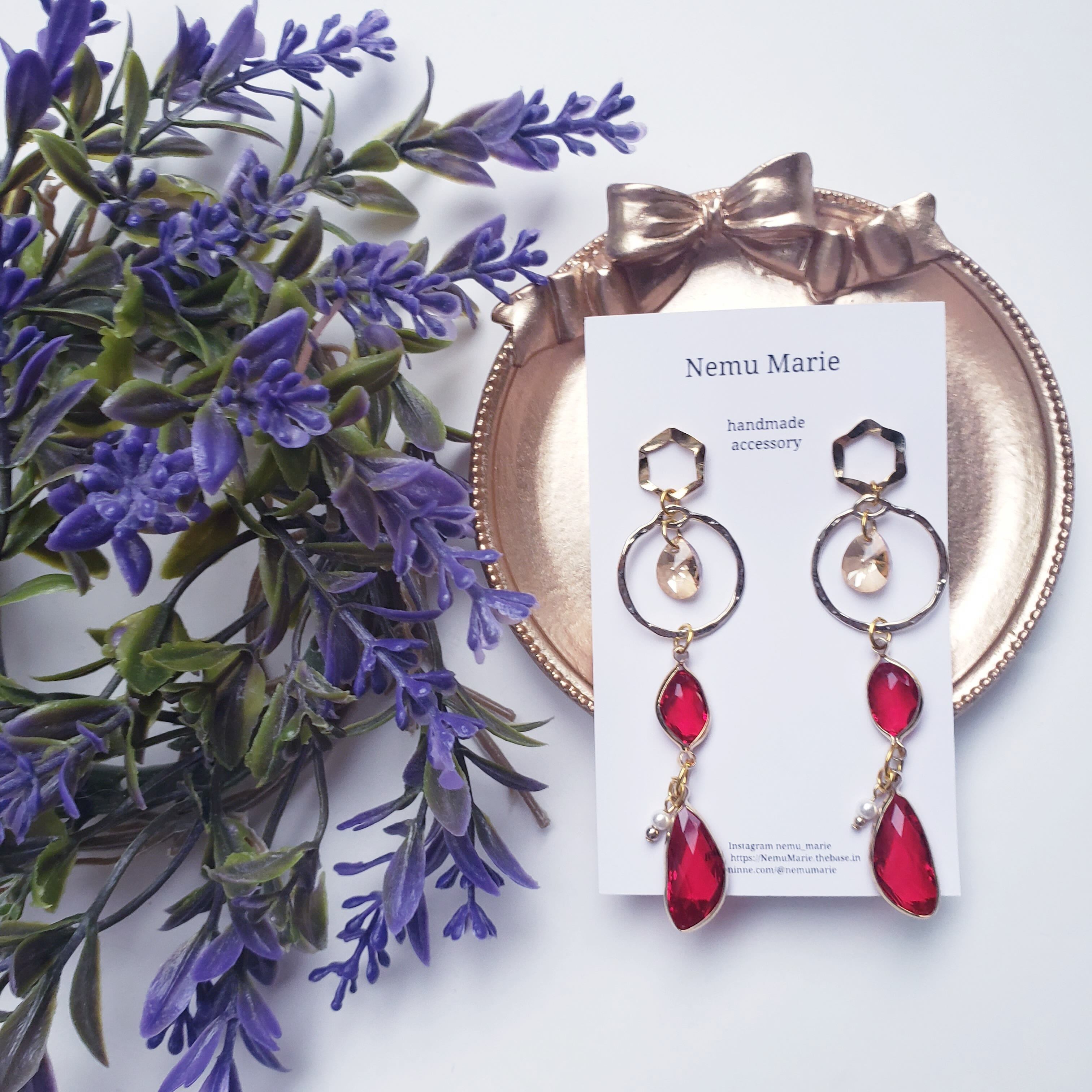 フープチャームの中にスワロフスキー、ゴールドシャドーを、 その下にフレームガラスの真っ赤なチャームを合わせました。