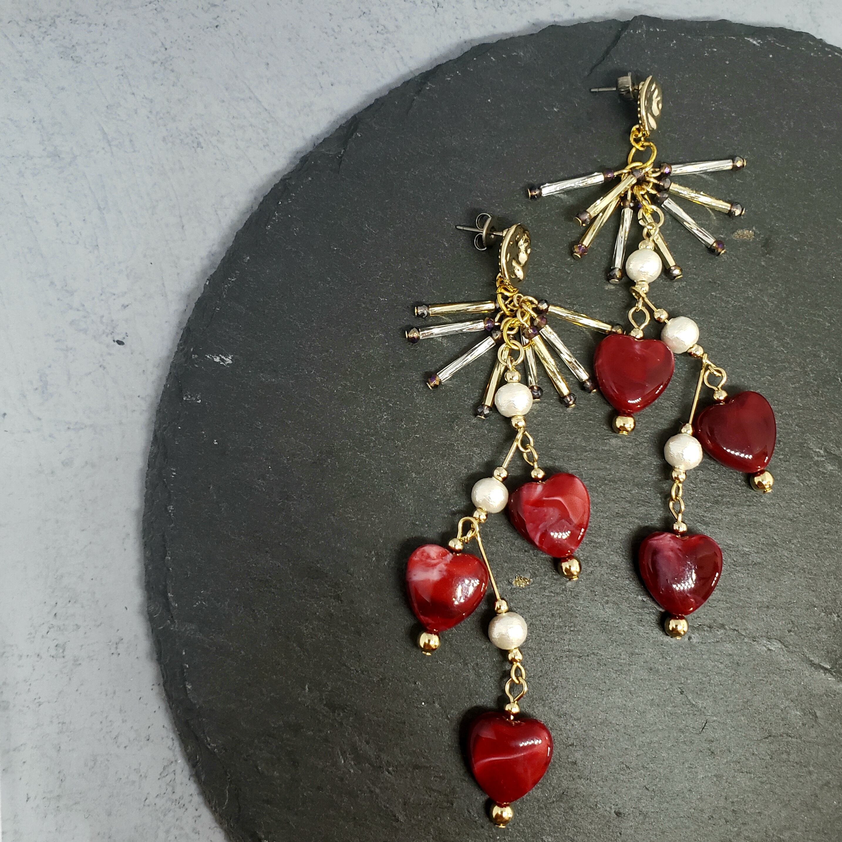 ハンドメイドピアス ハンドメイドアクセサリー 大振りピアス 大振り 個性的ピアス かわいいピアス ハートピアス 赤いピアス レッドピアス ロングピアス パーティー イベント 普段使い