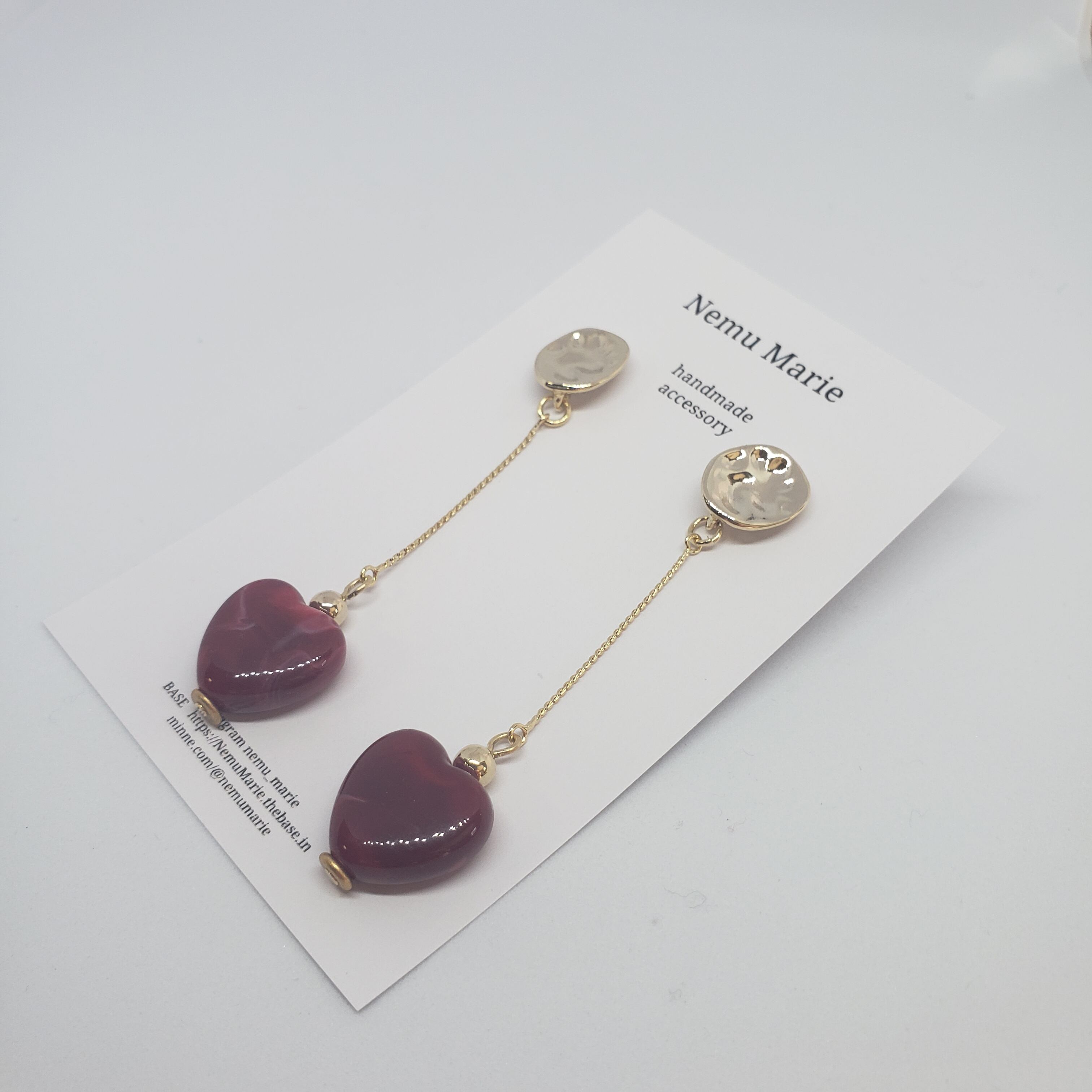 ゴールドのピアス、チェーンに真っ赤なハートが映えるピアスです。