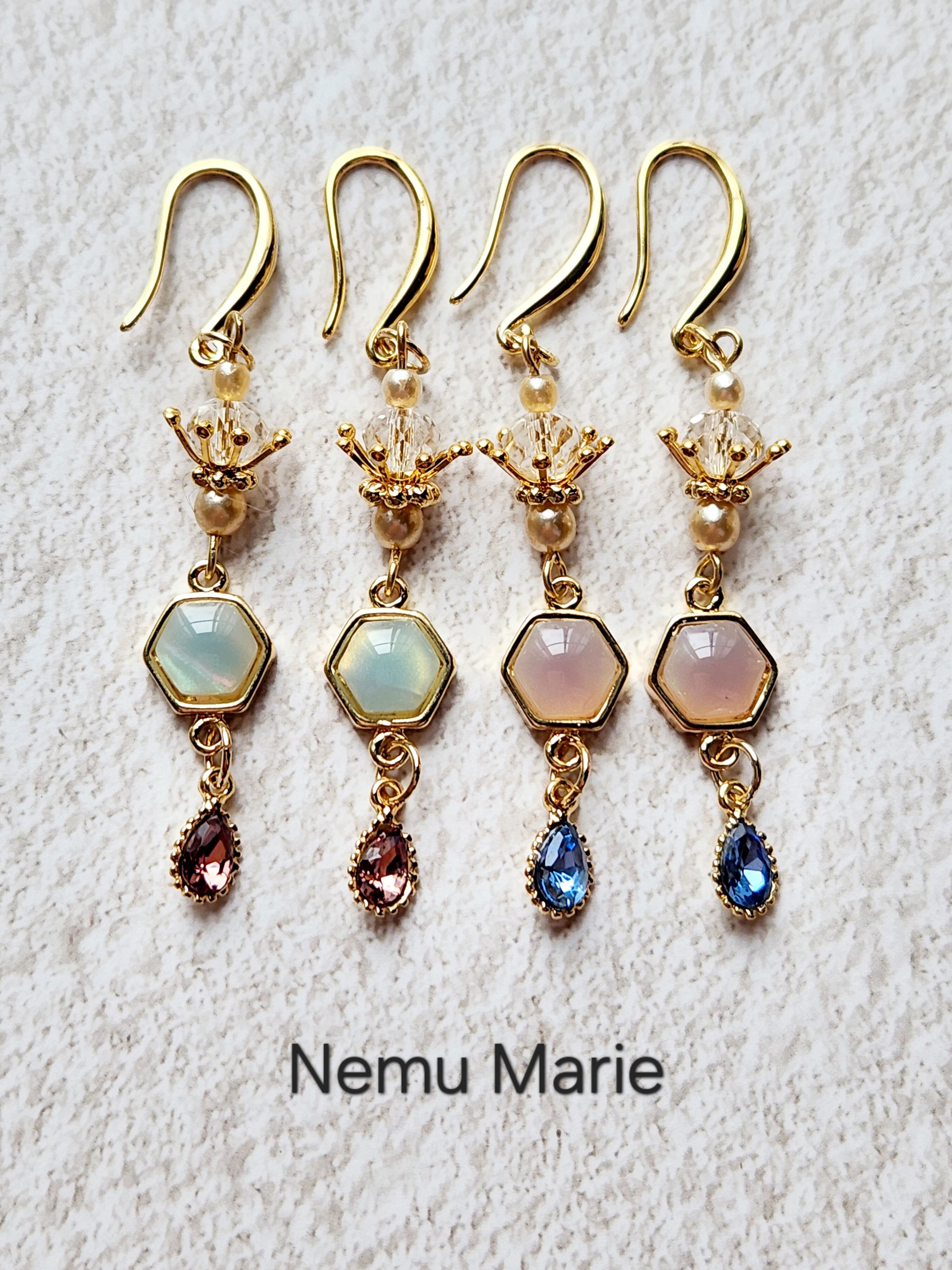 キラキラ輝くビジューとガラスフレームが絶妙にマッチした、クイーンピアスの登場です。ブルーとピンクのコントラストが目を引くデザインは、普段使いからパーティーシーンまで幅広く活躍します。耳元を彩る存在感は、あなたのスタイルに煌めきを添えてくれることでしょう。